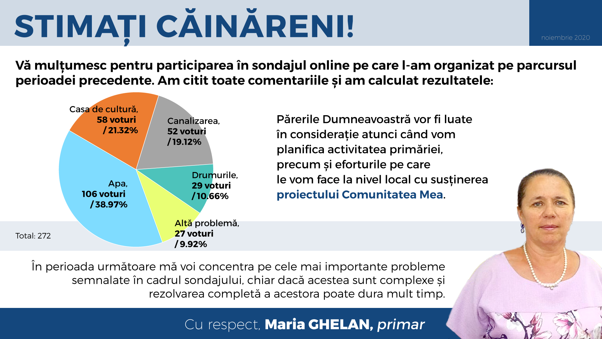 În cadrul proiectului Comunitatea Mea, pe rețeaua Viber, în grupul -Primăria în dialog a fost petrecut sondajul locuitorilor orașului unde toți doritorii au putut să-și expună părerea privind problema principală din localitate care urmează a fi implimentată. Mai jos vă prezentăm rezultatele acestui sondaj, Vă mulţumim tuturor pentru implicare activă.