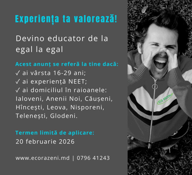 Asociația Obștească „Eco-Răzeni” provoacă tinerii și tinerele cu experiență NEET din localitățile raioanelor Ialoveni, Anenii Noi, Căușeni, Hîncești, Leova, Nisporeni, Telenești și Glodeni, să devină educatori de la egal la egal (peer-to-peer) în cadrul proiectului „Youth Connect: oportunități egale pentru integrarea socio-economică a tinerilor NEET din Republica Moldova”, prin intermediul căruia ne-am propus în perioada martie 2026 – mai 2027, să schimbăm spre bine viețile a sute de tineri din Republica Moldova.